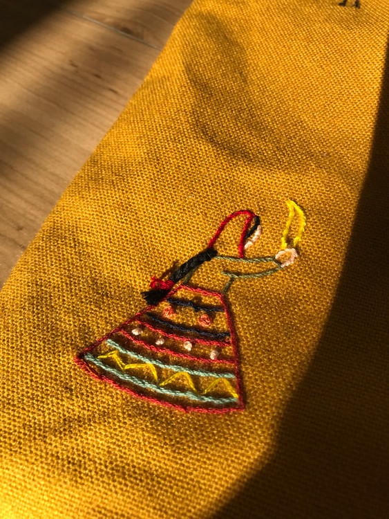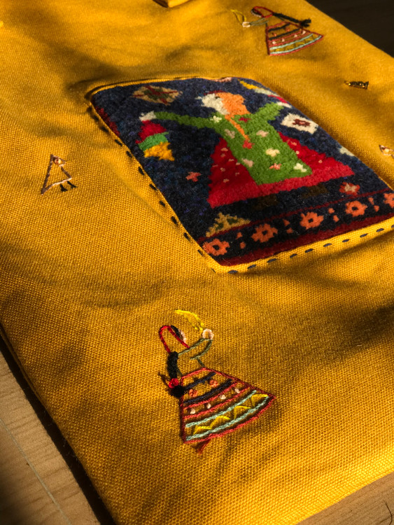 این اثر از آثار و زندگی عشایر الهام گرفته شده که در بافته، زن عشایر درحال رقص با دستمال بوده و نقوش جانوری با گلدوزی روی آن اجرا شده است.